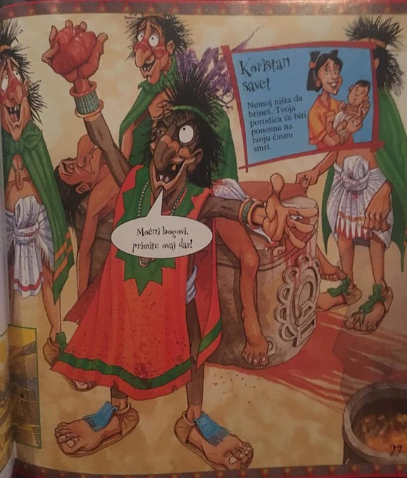 Među mnogobrojnim rečenicama koja deca ovog uzrasta možda ne bi trebalo da čitaju, a koja na zanimljiv način pokušavaju da približe istoriju i način života Asteka je i ona da, "većina zarobljenika biva žrtvovana tako što im vade srce oštim nožem".